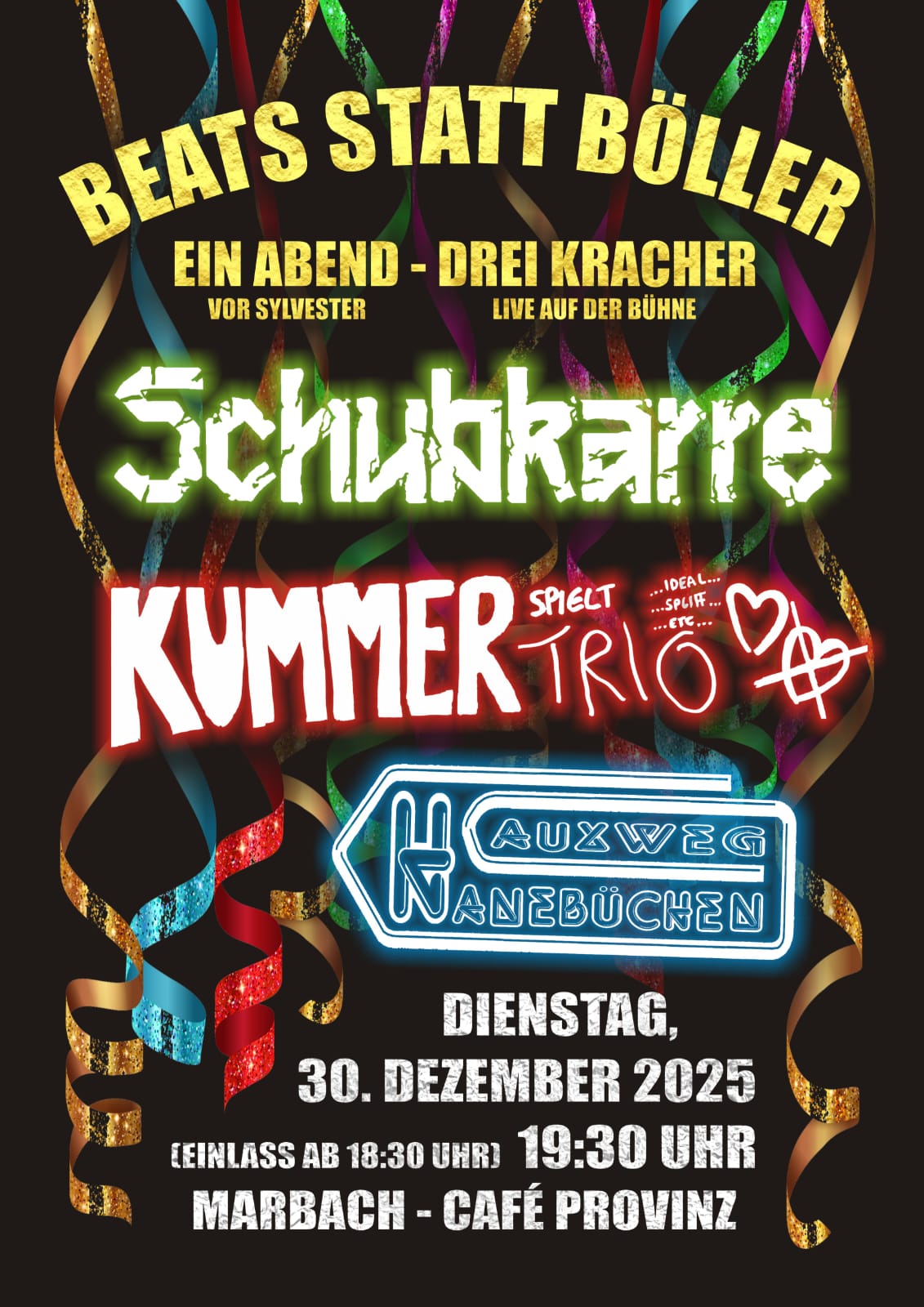 Mit dabei sind KUMMER (spielt Trio, Ideal, Spliff…) und AUXWEG HANEBÜCHEN.